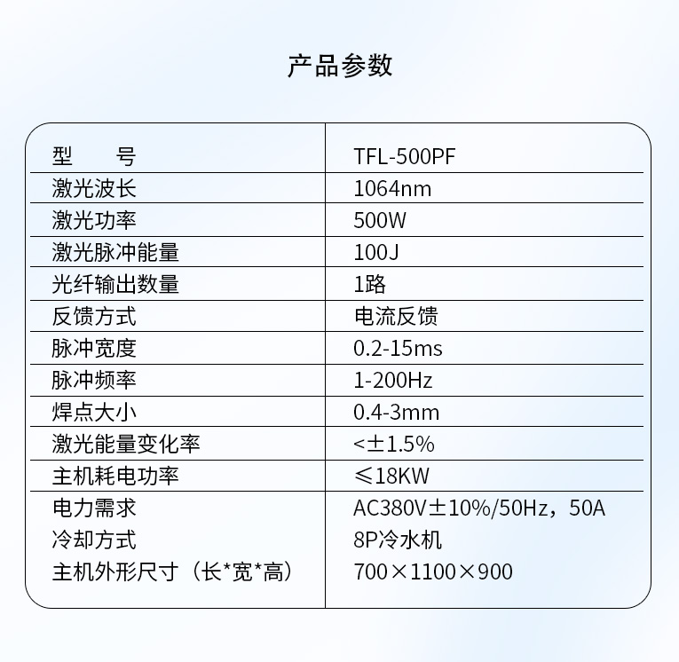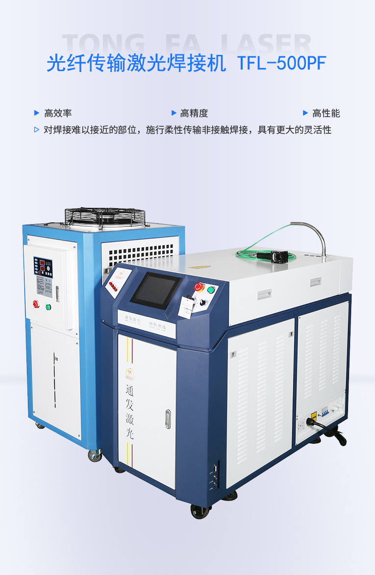 通發(fā)激光TFL-500PF光纖激光焊接機,激光功率大,經(jīng)過光纖優(yōu)化獲得卓越的光束質(zhì)量,滿足1.5mm以內(nèi)料厚,熔深1mm以內(nèi)的廚衛(wèi),家電,高速不銹鋼激光焊接加工。