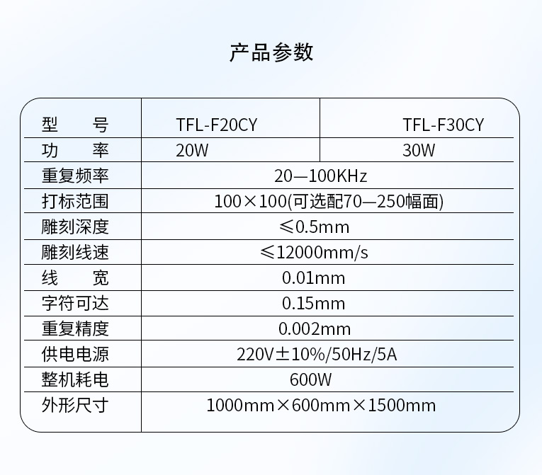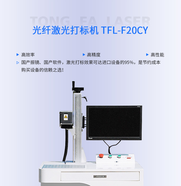 通發(fā)激光研發(fā)TFL-F20CY激光打標機,金屬材料和塑膠材料都進行打標加工,本激光鐳雕機配置成熟的20W和30W國產(chǎn)光纖激光器,國產(chǎn)振鏡、國產(chǎn)軟件,性價比高,激光打標效果可達進口設備的95%,是節(jié)約成本購買設備的信賴之選!
