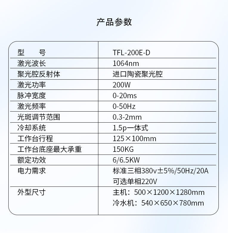 出口型模具激光焊機是通發(fā)激光公司專門為出口國外客戶使用而設(shè)計的系列機型TFL-200E-D,配置激光頭電動升降,同時配置操縱桿無極調(diào)速控制XY橫向和縱向電動移動。適用于各類精密注塑模具、壓鑄模具等模具激光修補焊接;同時也適合鑄件沙孔激光修補、模具崩缺激光修復(fù)、過切加工等的激光修補;各類金屬結(jié)構(gòu)件、金銀首飾的激光焊接加工。