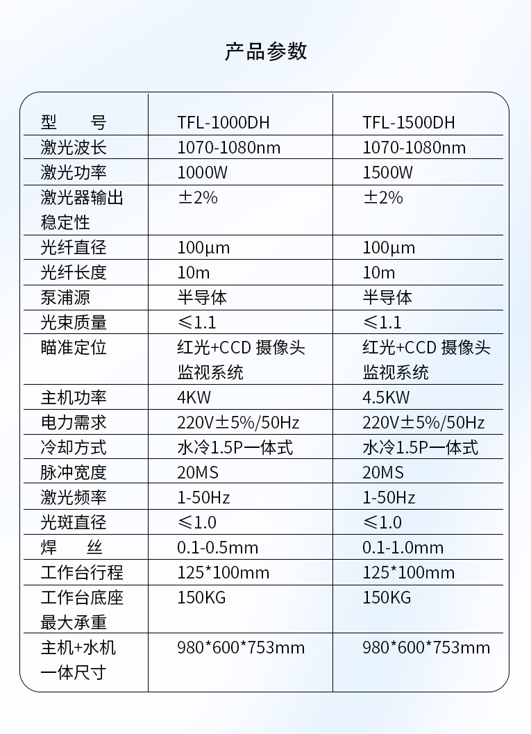 采用光纖激光器,反射率高,能量強(qiáng),免維護(hù),免調(diào)光,功耗少,相比傳統(tǒng) 模具焊來說,體積小,安全,穩(wěn)定性好超長(zhǎng)使用壽命。 1000W光纖激光器,滿足銅、鋁焊接量大的模具及產(chǎn)品焊接加工需要。 高承重底座及工作臺(tái),保持輕便靈活的優(yōu)點(diǎn),同時(shí)提供更高承載能力。 配備.1.5P大功率一體式水冷水機(jī),保證了大功率焊接的穩(wěn)定性。